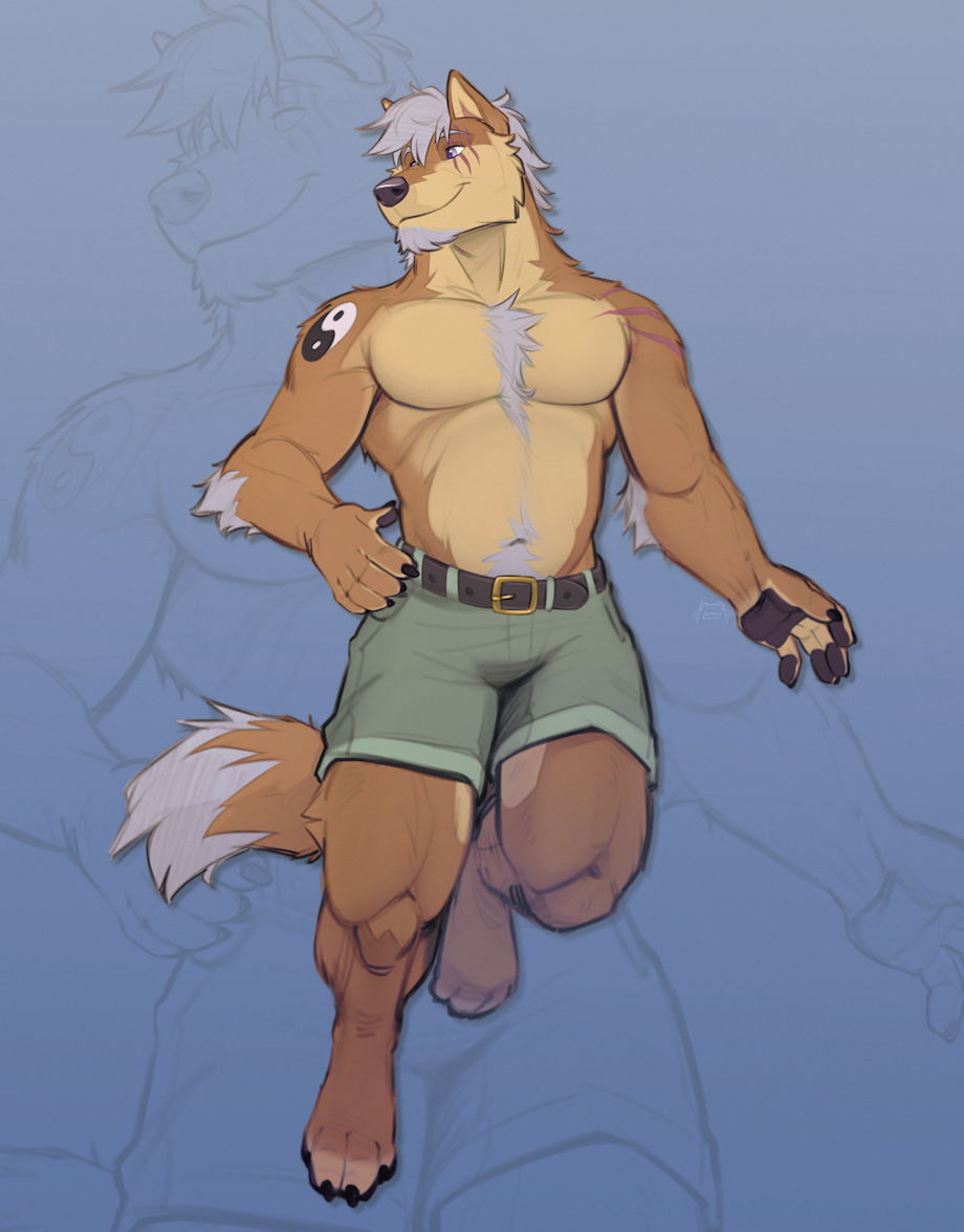 Yin and Yang tattoo on the right shoulder, three eye scars on the left shoulder, and three eye scars over the left eye. Silver-grey fur and eye colour