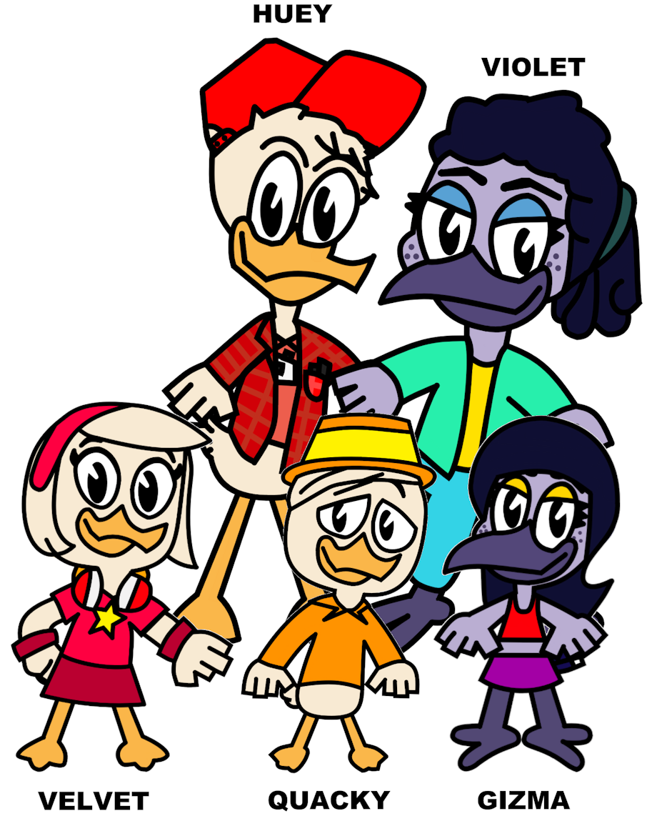 I did a future Duckburg family (my theory) for each of the three triplets (Huey, Dewey and Louie) and their longtime female friends one day each as a couple after getting married in different occasions with separate weddings, then they would having children of their own (triplets) and each having their own home (I would try to draw the background one day). I'm sure one day these fan kids i made would do adventure and follow their parents' footsteps who done adventures when they were their age. I did Huey and Violet first, (The Sabrewings) with their two daughters Velvet and Gizma and their son Quacky.