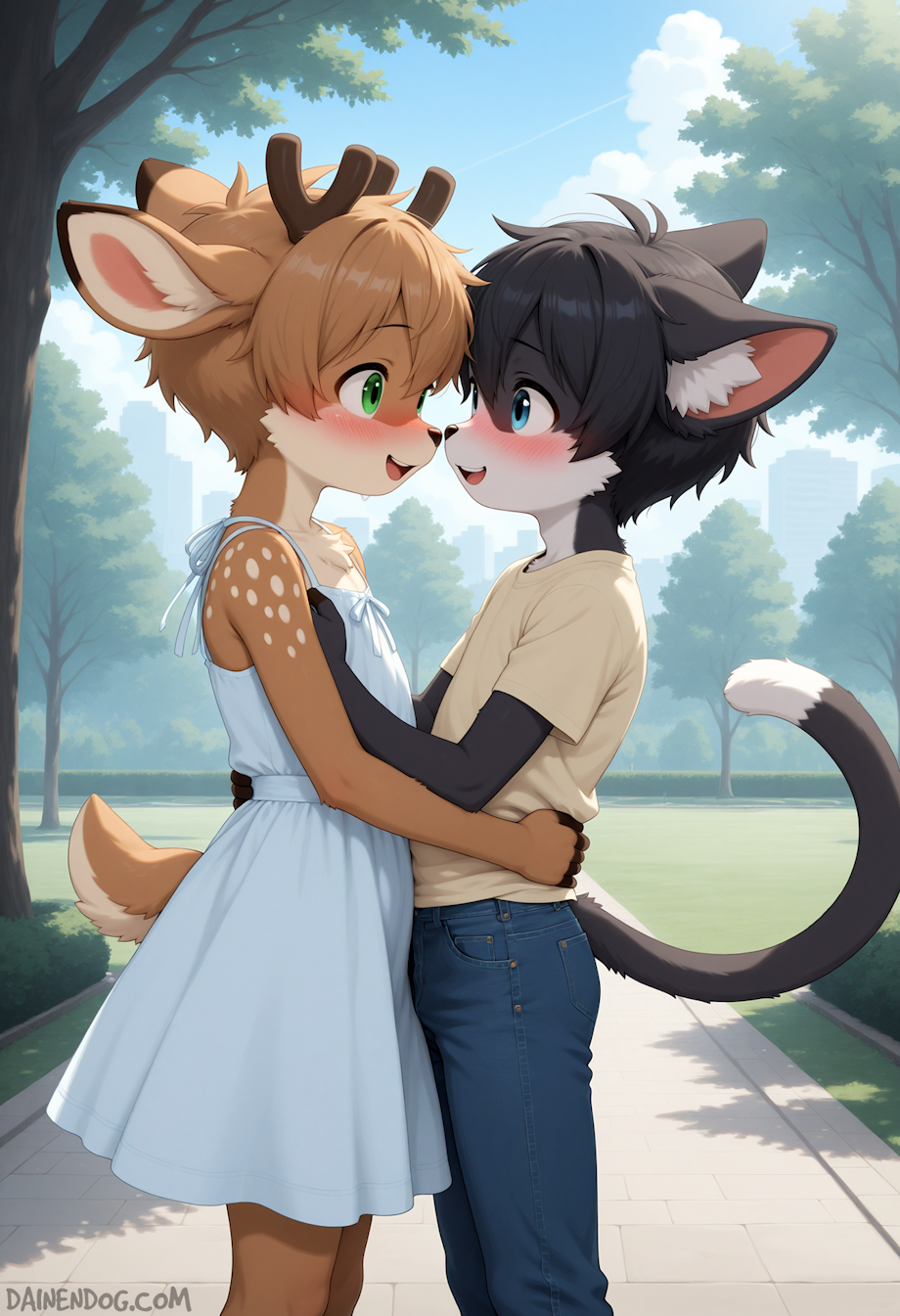 A few days later, they met at the park, the sky pale blue above and the air filled with the chatter of children playing. The cat wore a yellow t-shirt and jeans, his tail flicking nervously as he held a small box wrapped in simple paper. “I brought you something,” he said, ears reddening. The deer opened it slowly, his hooves trembling, and when the lid lifted, a light blue dress lay folded inside. His breath caught, and tears spilled down his cheeks as he hugged the cat tightly, burying his face in his friend’s shoulder. “Thank you… thank you so much.”