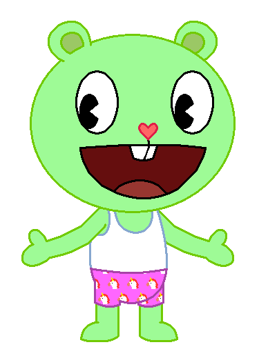 Here's something cute, adorable and funny I did. It's Flippy from HTF/Happy Tree Friends in underwear that males or females actually wear under their clothes. He is wearing Disco Bear's white sleeveless shirt/sleeveless top that is a tank top and tank shirt undershirt and A-shirt and vest and singlet from his workout and exercise and athletic and fitness and sports clothing/clothes in place of his best friend's white tank top from different Happy Tree Friends TV Series Episodes/Shorts along with Splendid's white undershorts and shorts and boxers underwear and underpants and undies with dark red and dark pink hearts on them from the episode: Gems the Breaks. Looks cute for a man bear to wear boxers and undershirt, doesn't it? And also, I forgot to tell you that the undershirt that he's wearing is from the episode: Ipso Fatso.