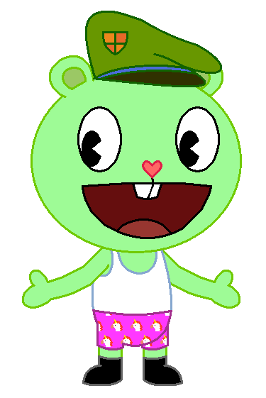 Here's something cute, adorable and funny I did. It's Flippy from HTF/Happy Tree Friends in underwear that males or females actually wear under their clothes. He is wearing Disco Bear's white sleeveless shirt/sleeveless top that is a tank top and tank shirt undershirt and A-shirt and vest and singlet from his workout and exercise and athletic and fitness and sports clothing/clothes in place of his best friend's white tank top from different Happy Tree Friends TV Series Episodes/Shorts along with Splendid's white undershorts and shorts and boxers underwear and underpants and undies with dark red and dark pink hearts on them from the episode: Gems the Breaks. Looks cute for a man bear to wear boxers and undershirt, doesn't it? And also, I forgot to tell you that the undershirt that he's wearing is from the episode: Ipso Fatso.