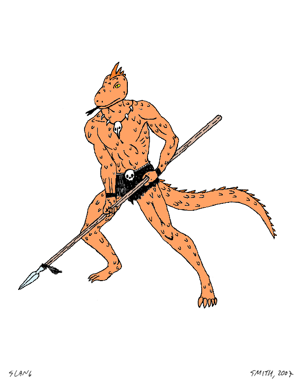 Slang is a Reptile Man, stronger than a human being, with scaly skin, claws, teeth, and a tail. He is well-adapted to a desert climate, able to endure the burning sun, searing heat, bitter cold, and windblown sand without discomfort, and go for days without water. He wields a spear with great effectiveness, and is a skilled hunter and tracker. While he cannot read or write, and is generally ignorant about the world outside the Great Wastes, he is quite intelligent, and fiercely loyal to those few he calls friends. He is a somewhat stoic individual, accepting both good and bad fortune with equanimity. His philosophy of life can be summed up as "What is, is."