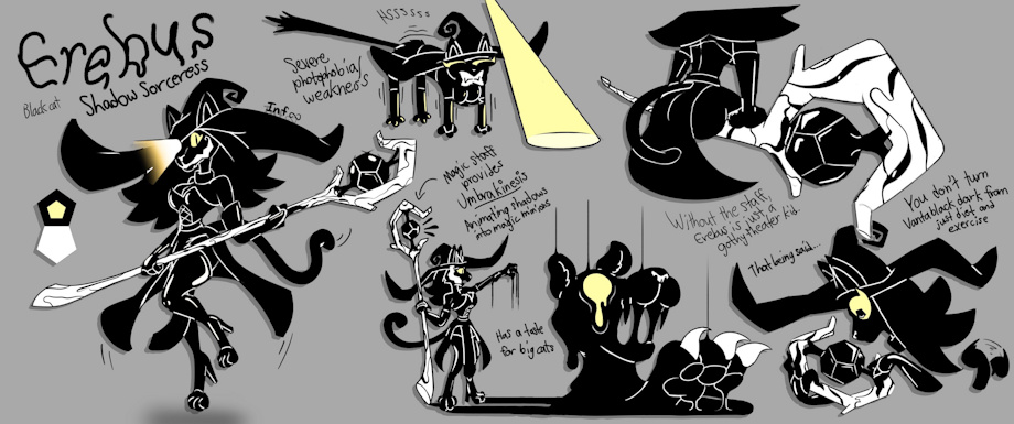 With her enigmatic staff and a need for attention, Erebus, the Shadow Sorceress, takes to the super stage with gusto and an inky, dark shadow monster cat. Give her an audience, give her a nemesis, and she'll be happy being a villain of the week. Otherwise, Erebus might tend to...improvise.