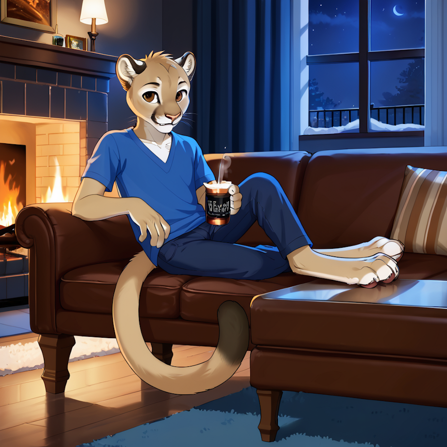 The best friend of the caracal was invited to go along for a ski trip, and even as he's sitting on the couch drinking some hot cocoa, the cat is looking quite cute.