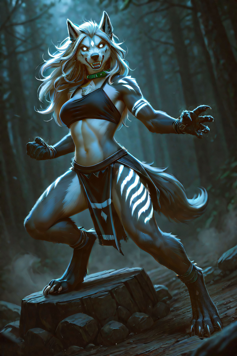 <14sh> (female:anthro:mightyena:1.6) (werewolf) (black shins, black ankles, black forearms:1.3) (white diamond forehead mark:1.5) (gray fur, white belly:1.5) ("black diamond marking on forehead":1.3) (long hair, big hair, gray hair:1.3), (white eyes, glowing eyes:1.3), (green collar:1.3). (striped body, glowing stripes, white stripes:1.4) (claws, digitigrade:1.2), (white belly:1.4) (toned legs, toned arms:1.3), (clothes:2)