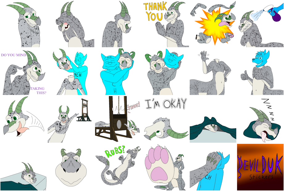 Fergus here. Achaius has a bunch of these stickers of him and we've never shared them outside of telegram. Devilduk worked hard to make these, so I figured I might as well post them. I'm not making an individual post for all of them. Luckily I had a .bat script made that groups picture files into a collage like this. I need some stickers of me sometime..