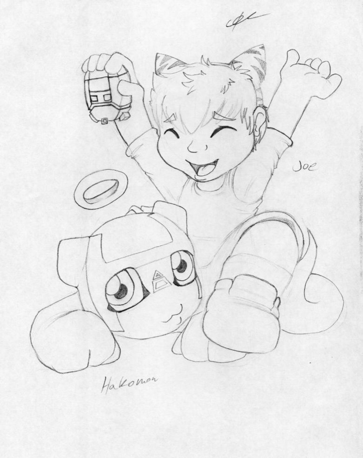 I'll prolly explain a bit deeper later on what it was going to be about. but here is my best friend's little bro, Joey with his digimon, Hakomon. (he named him awl his ownnn X3 awwwe) he was wearing those cat ears that day, and ah felt like putting them in there to see how he reacted XD