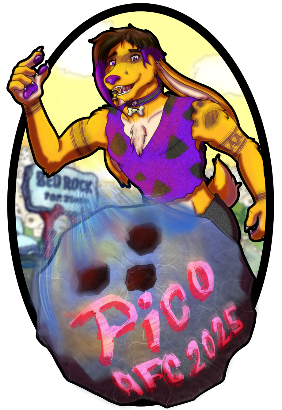 My (currently unprinted) badge for AFC 2025. Since the event theme is "Modern Stone Age Furry", I decided a Flinstones bowling theme worked well!