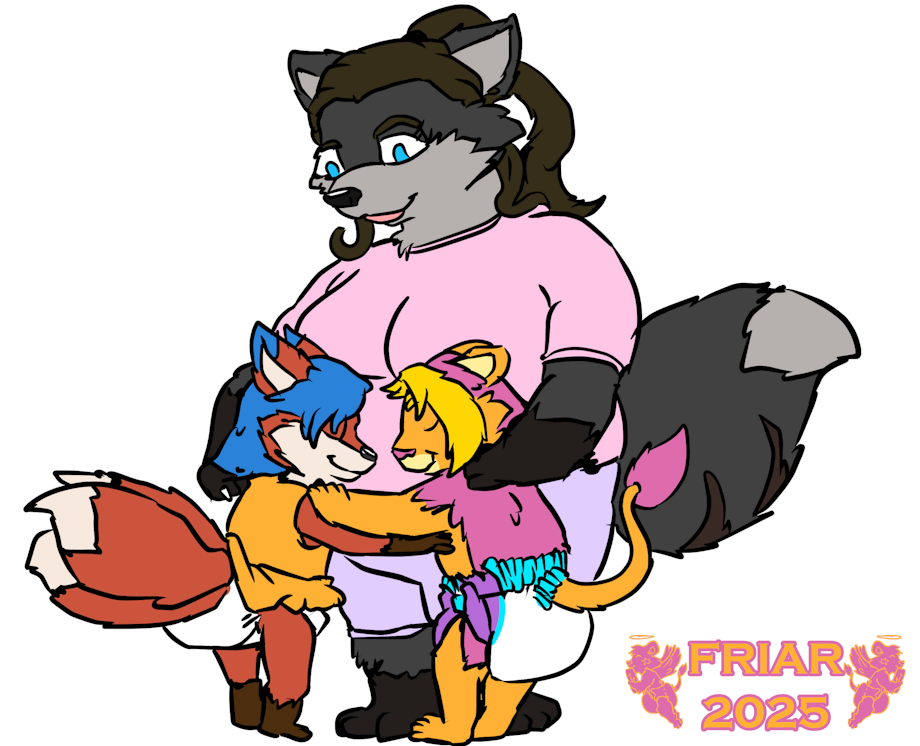 Illustration of Alfador the diapered three tailed kitsune, Friar the diapered lion and Mama Zephie the wolf hugging by a poolside viewing of cartoons on a large screen in the background.