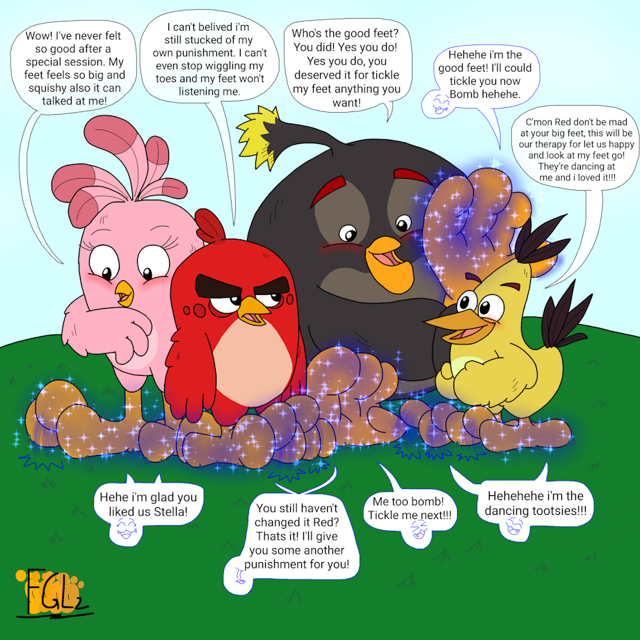 Red haven't learn of any lessons of his anger issues while having him some cursed feet growth punishment except of their three friends who already had changed and they're now into of their big grown feet. Chuck, Bomb and the new comer Stella, they're loving of their feet even sentient and grew huge meanwhile Red on the otherhand which was not a fan of having perma-sentient bird feet which will getting another treatment for some cursed feet punishment in future.