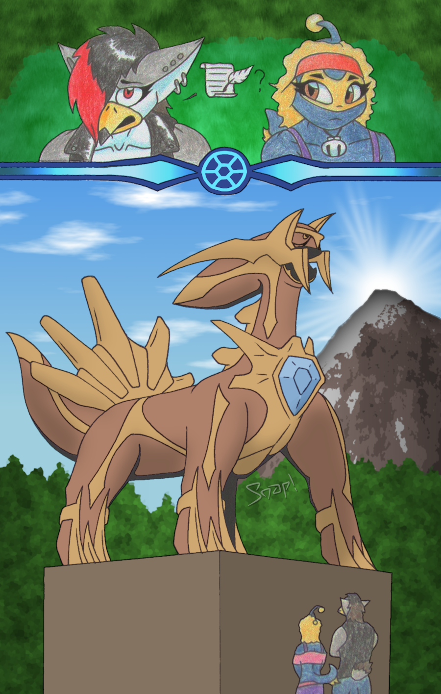 "I think so," nodded the big bird. "I just couldn't get away from her tail." Every bandage and plaster was a testament to that fact, each telling its own story of the various wheeling punches and kicks Roisin had managed to duck and dip away from, only to be met with that mighty tail, longer than she was tall, instantly whipping around to follow Kerry's motion, its crowning fins delivering a vicious Slash with every swing, carving into the Staraptor like razor blades over and over, until the officials were forced to step in, and the match was finally brought to a halt.