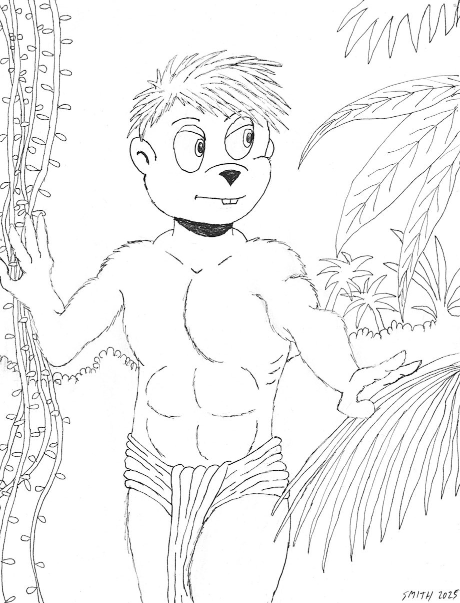 This is a picture I drew inspired by a story I am working on in which Alvin goes back in time to 1887 and participates in the events of the H. G. Wells novel, The Island of Dr. Moreau. Since it's a tropical island and he couldn't bring any modern technology with him, he's only wearing a loincloth.