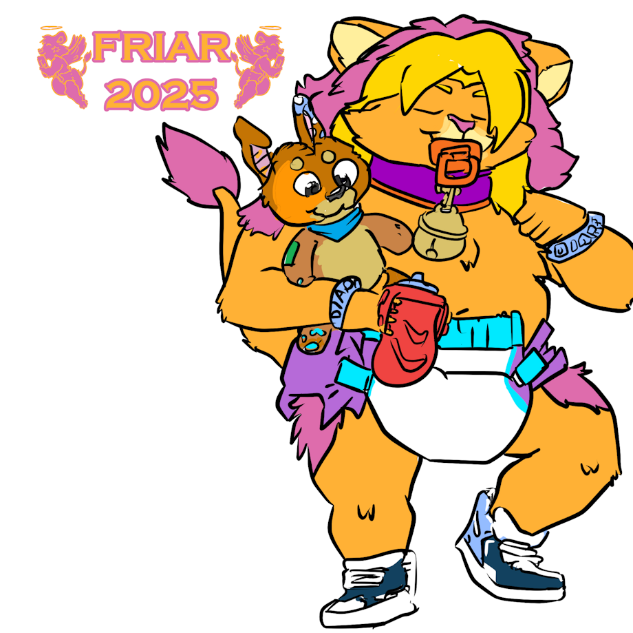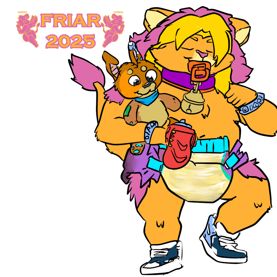 Illustration of Friar the wet and messy diapered lion toddling around with a patches plushie and a sippie cup while wearing sneakers by a staircase.