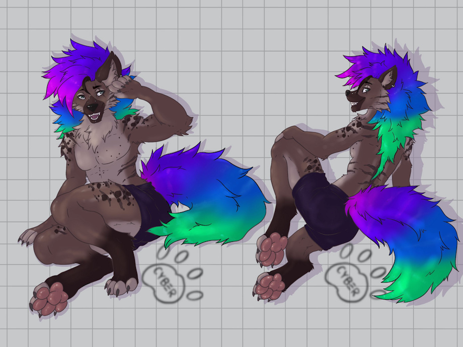 I felt it was high time to revisit the idea of myself as a hyena, since they're a relatively regular fixture in my dreams, and I read a fascinating guide about best practice for keeping striped hyenas in zoos. This time around I thought it would be fun to sport a mixture of traits of spotted and striped, with the ample floofy manes and tails of the latter seeming like they would give plenty of opportunity for being dyed in fun colours (I like to think one of the characters artist of this piece really went to town snazzing my floof up for the occasion). My previous hyena had spots on his chest in the shape of the big dipper, so I thought it'd be fun to mix it up with another constellation this time.
