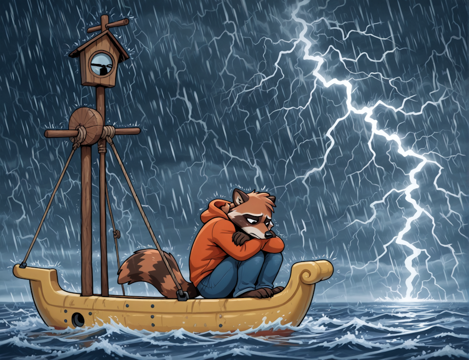 Prompt: A racoon anthro sails into a storm alone, storm, raccoon anthro, furry, orange fur, pattle boat, hoodie, blue jeans, depressed, sad, looking down,
