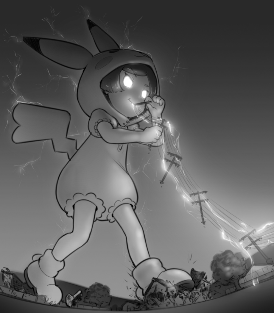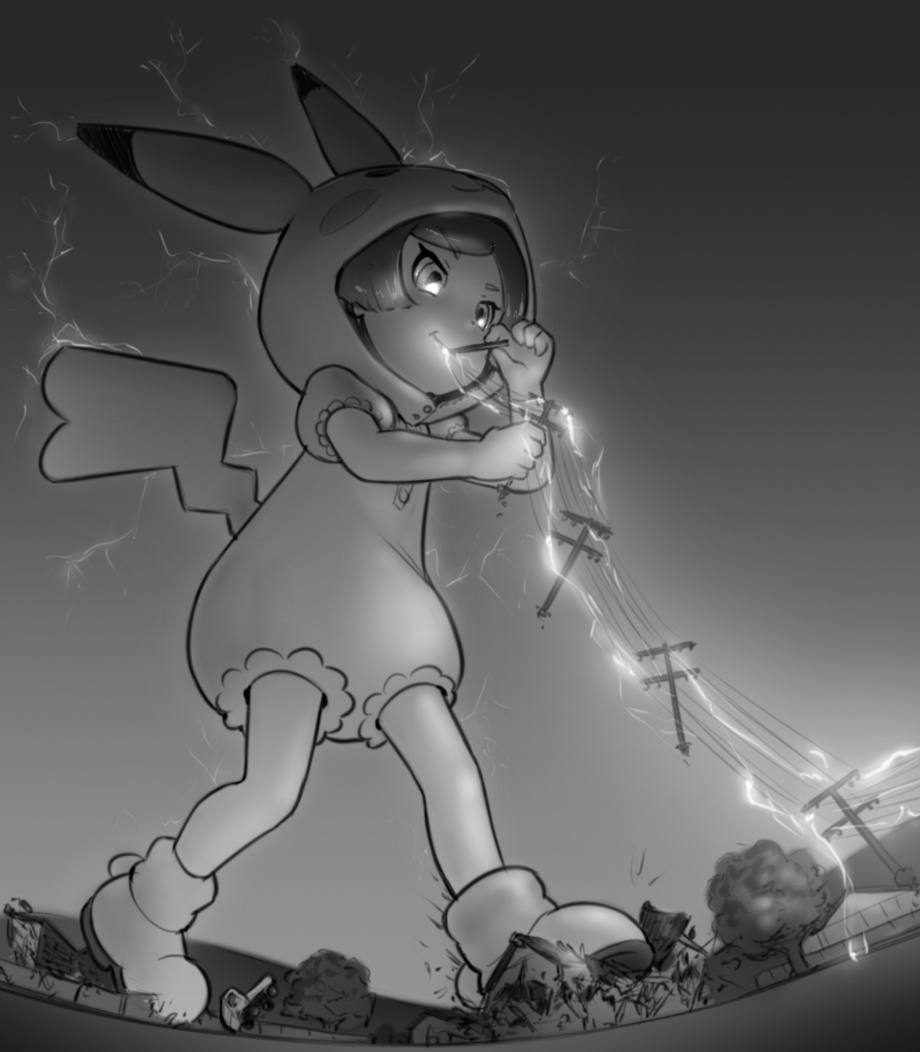 Ooooh, always nice to see the Poke Kids and their costumes get some massive treatment~ It is silly how believable this scenario is and how it took this long to even realize it. Literally eating power to grow. I really love the detail put into the houses getting crushed; neighborhood rampages are always fun. Fantastic work here!