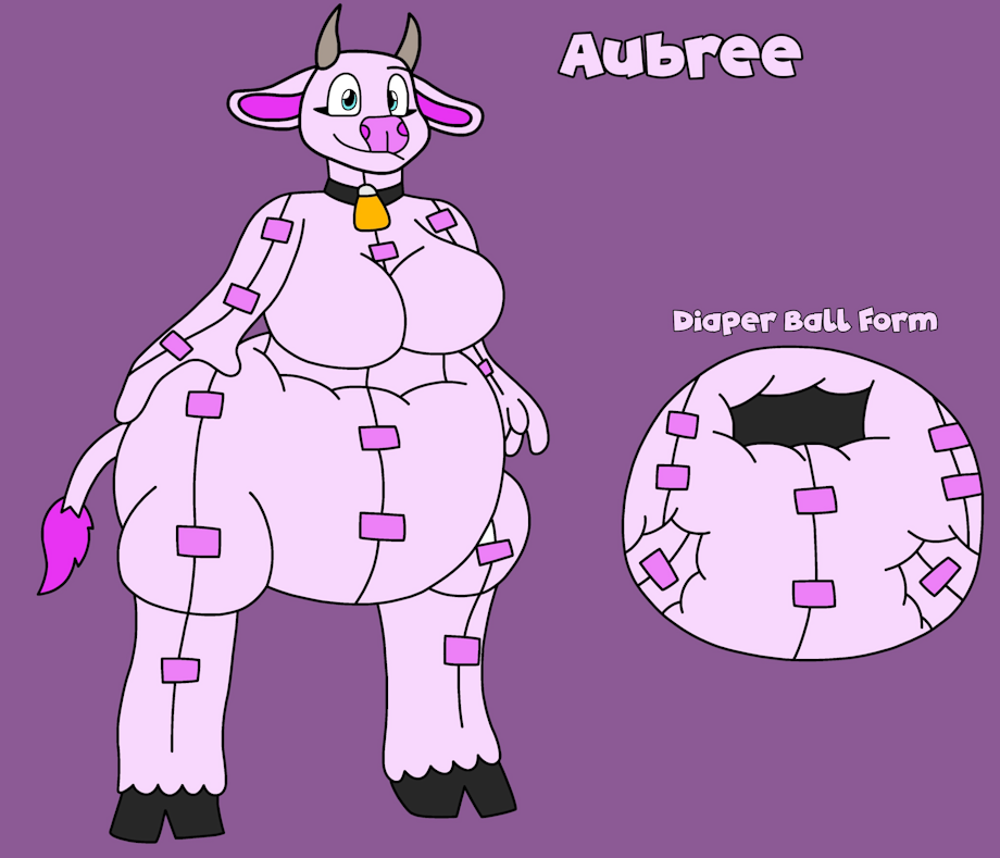 Eventually, she grabbed not one, but two magical items that looked like ordinary objects. One was a cowbell, and the other was a kind of crinkly pink cloth. Unlike the other magical items, Aubree managed to activate these two, which she soon regretted as they both began changing her at the same time. The pink cloth turned out to be a diaper, and as her body morphed, she started to take on a cow-like shape, mooing like a dairy cow. Her body, initially transforming with white and black markings, changed to a pure light pink color. Thus, the once-depressed woman became an overjoyed diaper critter cow.