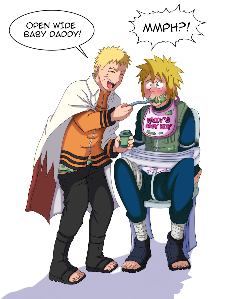 One evening, Naruto tried to convince him to wear a pink bib with “Daddy’s Baby Boy” embroidered across it. Minato refused, snapping that he was no one’s baby. Naruto spanked him soundly, strapped him into a high chair, and spoon-fed him mush like an infant.