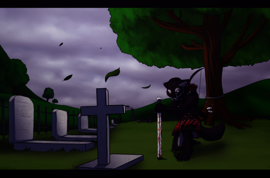 As he knelt there, the sky darkened and a wind picked up. Rain began to fall but he barely noticed it. He had been out in the elements since he left with his sword and bow to fight the war. He began to think about taking his own life. He had little reason to live now, and his scars were very deep after so many years of fighting. He looked down at his blood stained sword. He never wiped the blood from the blade. Every enemy that fell to it left it's mark upon the steel. It would be so easy to add his own to it.