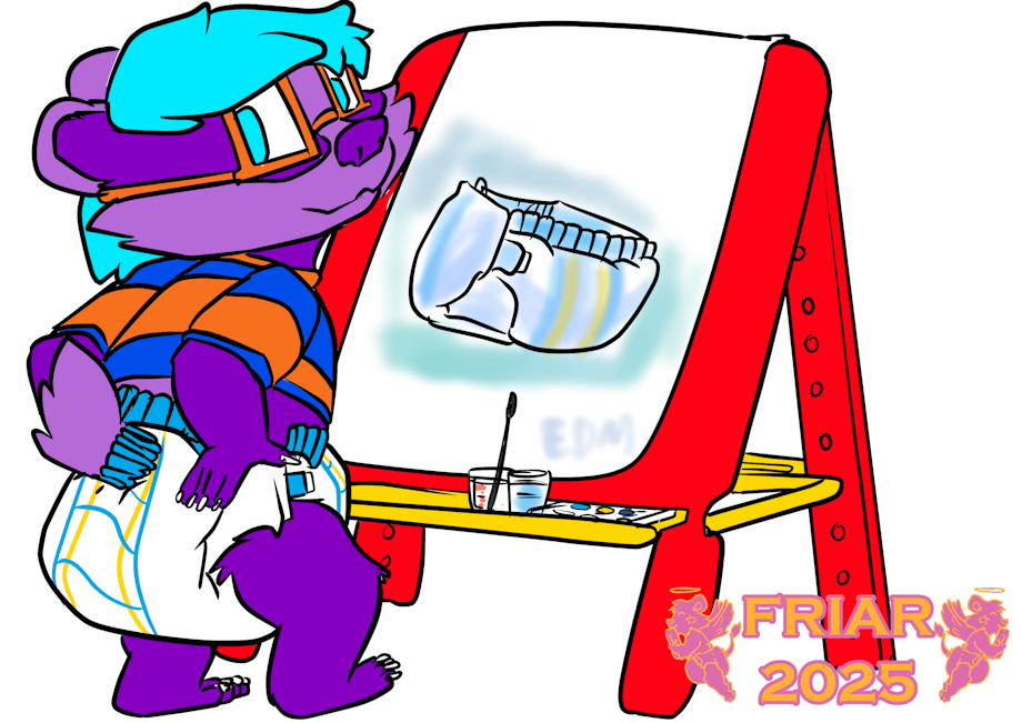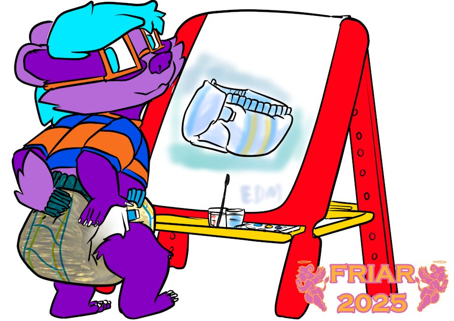 Illustration of Everett the wet and messy diapered badger looking at the viewer after watercolor painting a picture of a diaper in his bedroom while his snake plushie watches.