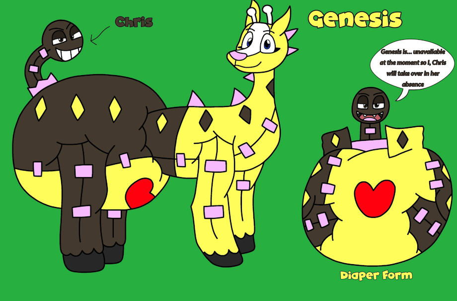 Before long, Gina Smith had transformed into a diapercritter version of a Girafarig. She was quite embarrassed about having a very large backside, not to mention the fact that she was now a living diaper. Meanwhile, Chris became her new tail head and was baffled by the situation but didn’t mind his new form, as it allowed him to enjoy Genesis's new padded rear, much to her annoyance.