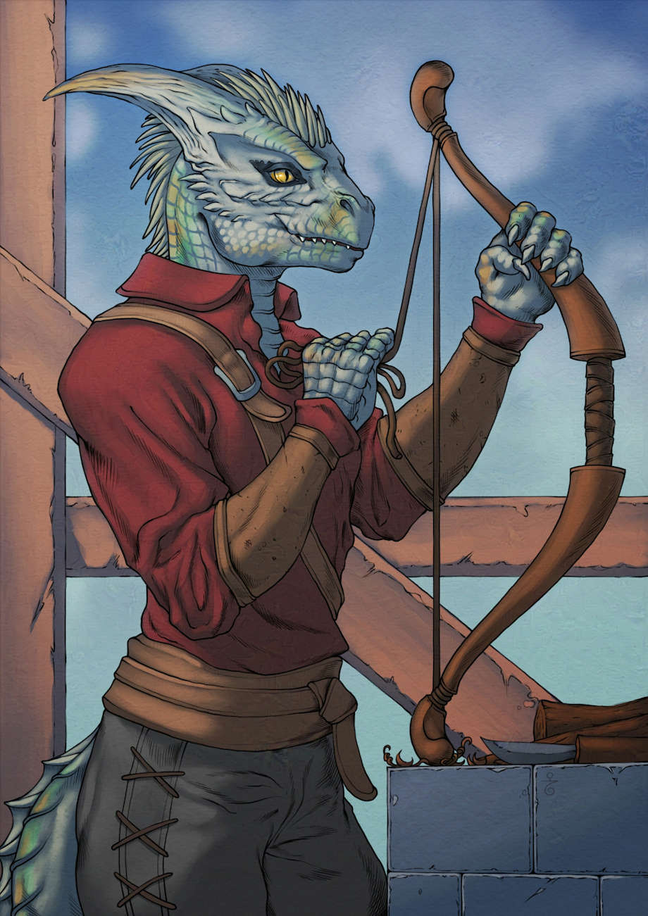 Voldas, his father, worked as a weapons smith of Bows and Arrows, an extremely unexpected thing for a copper dragon to do. He was doing it at the time for two reasons: Both earn his keep in the city, his Copper dragon self liking socialisation and to entertain, and also to pay back the city for a past offence that he committed, doing this by creating bows and arrows for the flaming fist, who he charged a fraction of a usual price for. Due to this Snjokorn learned this trade through his father, from a young age introduced to it and how to do it. Despite being very well gifted in sorcery, Snjokorn also learned how to use bows, though for self defence and attack he will use sorcery 99.9% of the time.