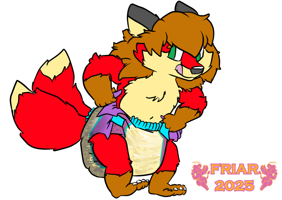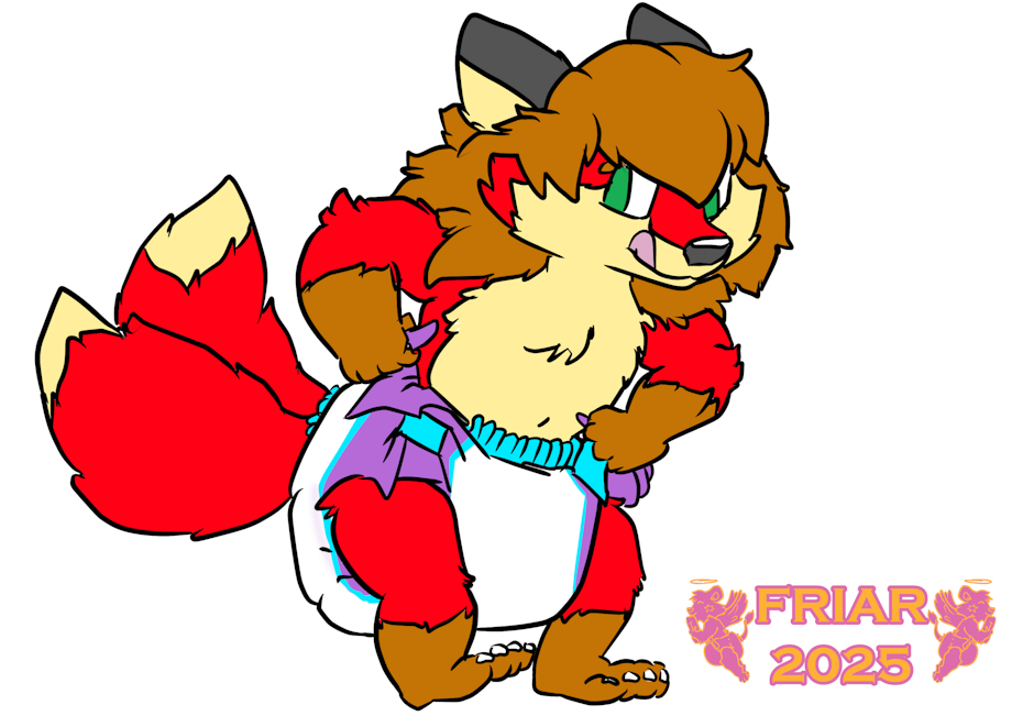 Illustration of Ozzy the wet and messy diapered two tailed fox holding up his diaper by the sides while he waddles in his crib. A watercolor painting of Ozzy is framed on the wall.