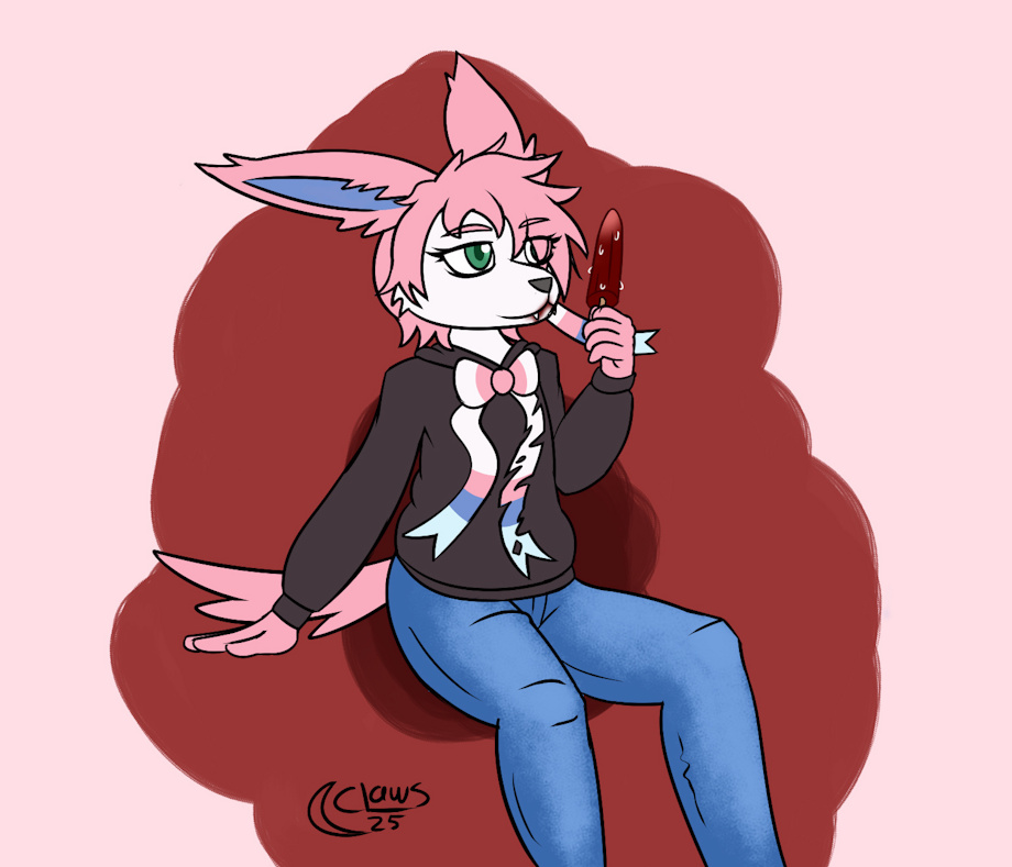Doodled a friend of mine! She's a trans sylveon with an interesting character concept: a female eevee who evolved into a male-bodied sylveon. Also she's a vampire. Slurping on a blood popsicle. I don't know who makes those.