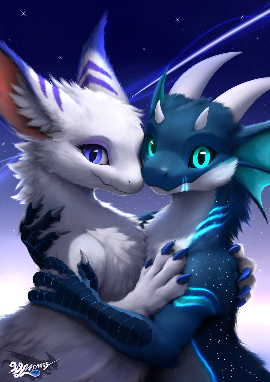 A very special artwork of Wyverness and Hidoragon. One white as the gentle winds, the other blue as the deep night sky. What began as friendship slowly grew into something magical, until the winds and starlight no longer drifted apart, but moved as one.