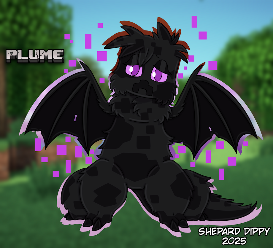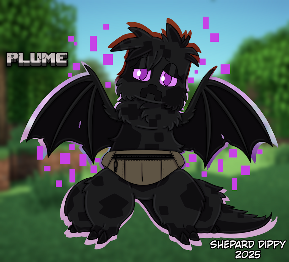 Meet Plume, a Creeper Ender hybrid. Anxious, defensive, and feeling like everyone is staring at them, they prefer to work in the mines as a treasure hunter, collecting gems and valuables for those who seek it, unable to help but keep a few for themself of course, storing it all in their fanny pack.