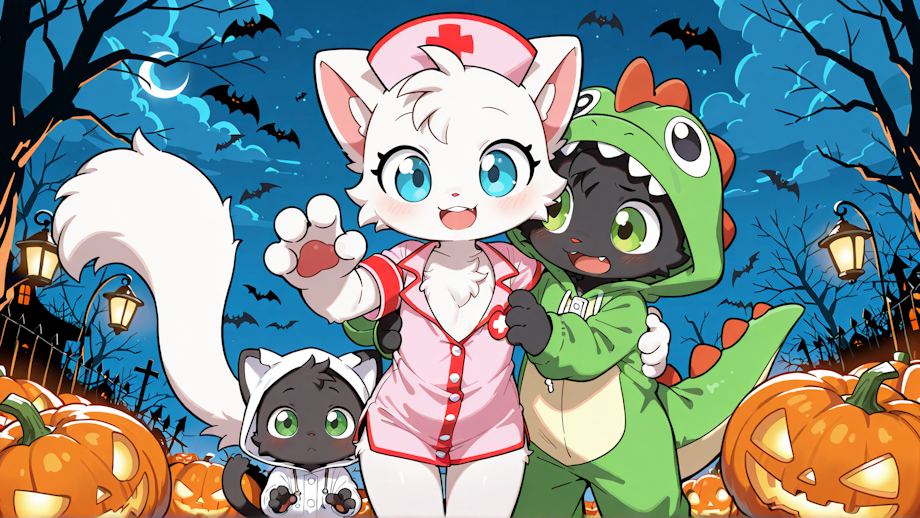 PROMPT: ((straight-on portrait)), masterpiece, extremely detailed, male/female, duo, score_7, score_8, score_9, furry, masterpiece, best quality, newest, absurdres, outdoors, Halloween party,