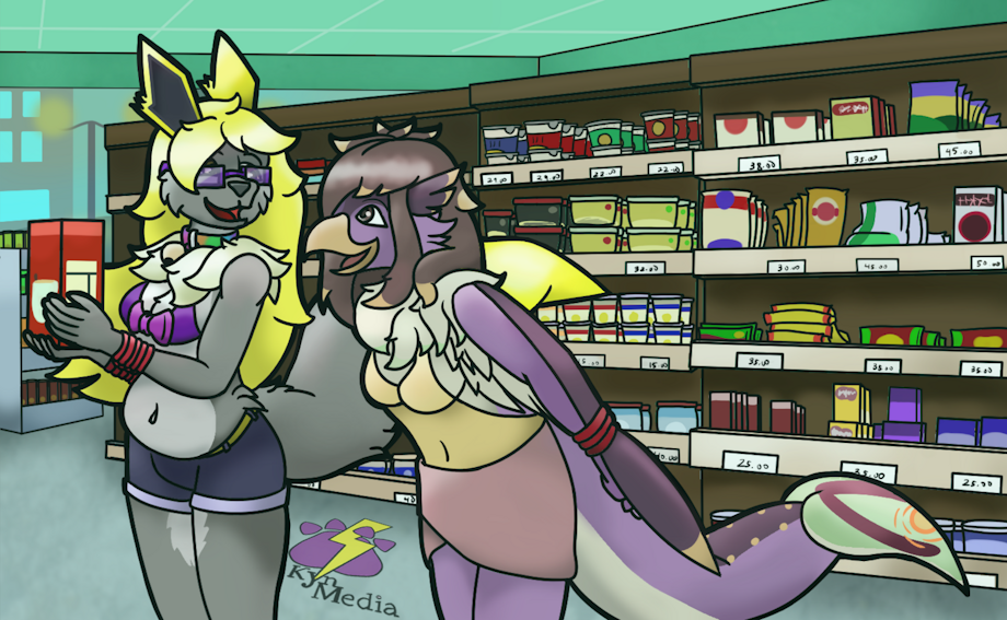 "Hehe, alright alright. Let's get to our cart first and drop these off. Kinda hard to hold more than one of anything with my wrists bound like this," Kyn chuckles, leading her friend back to where they left their groceries.