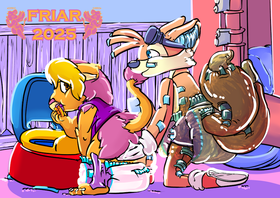Illustration of Toffee the wet and messy diapered lion reclining in his toddler bed with his sippie cup of juice.