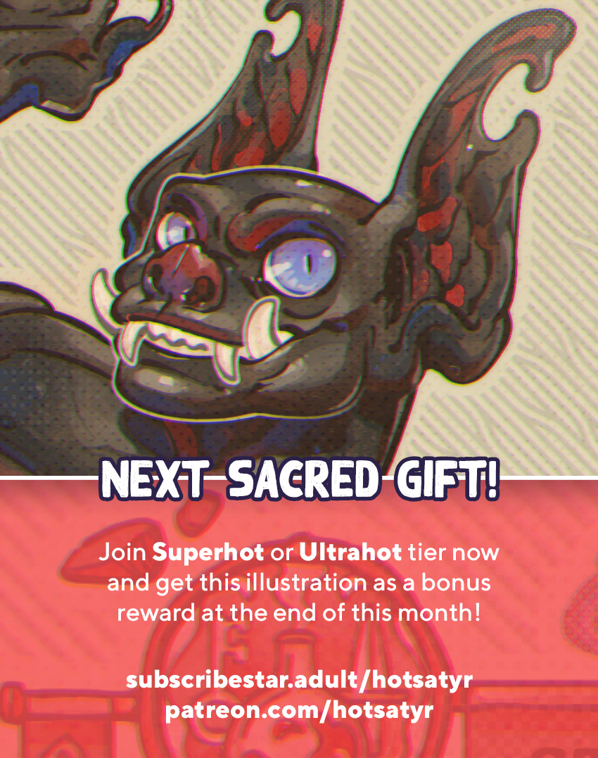 Sacred Gifts are exclusive illustrations for Superhot and Ultrahot members, who vote at the beginning of each month on the theme and receive the artwork at the end of the same month. Past Sacred Gifts can be purchased in Sacred Gifts Shop