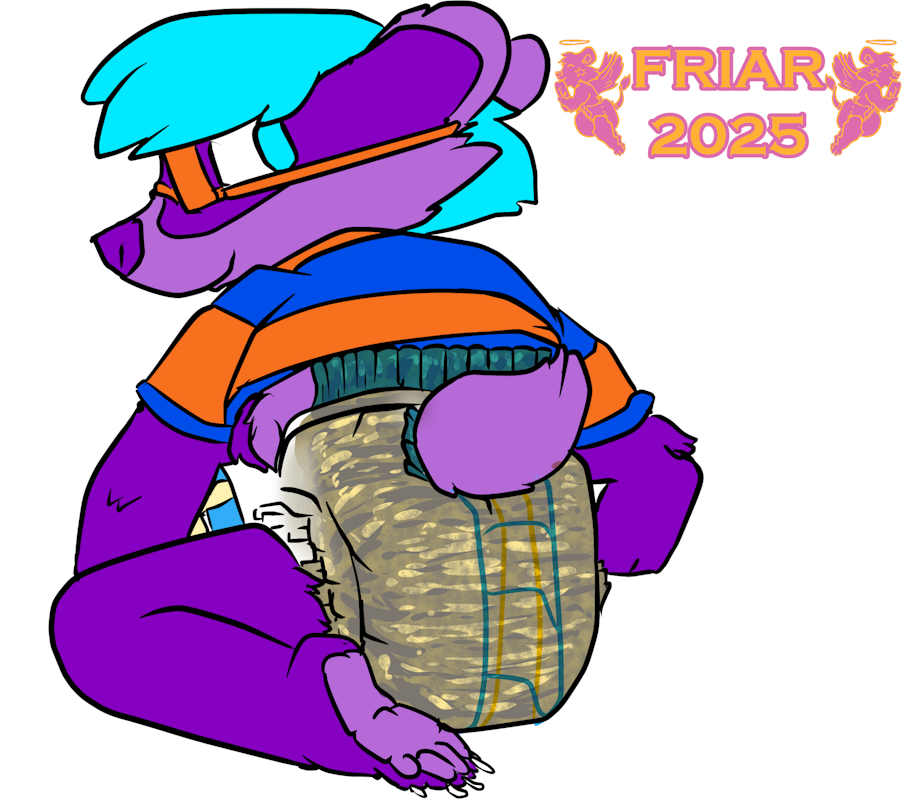 Illustration of Everett the wet and messy diapered badger next to a mushroom by a hollowed out log, looking back at the viewer.