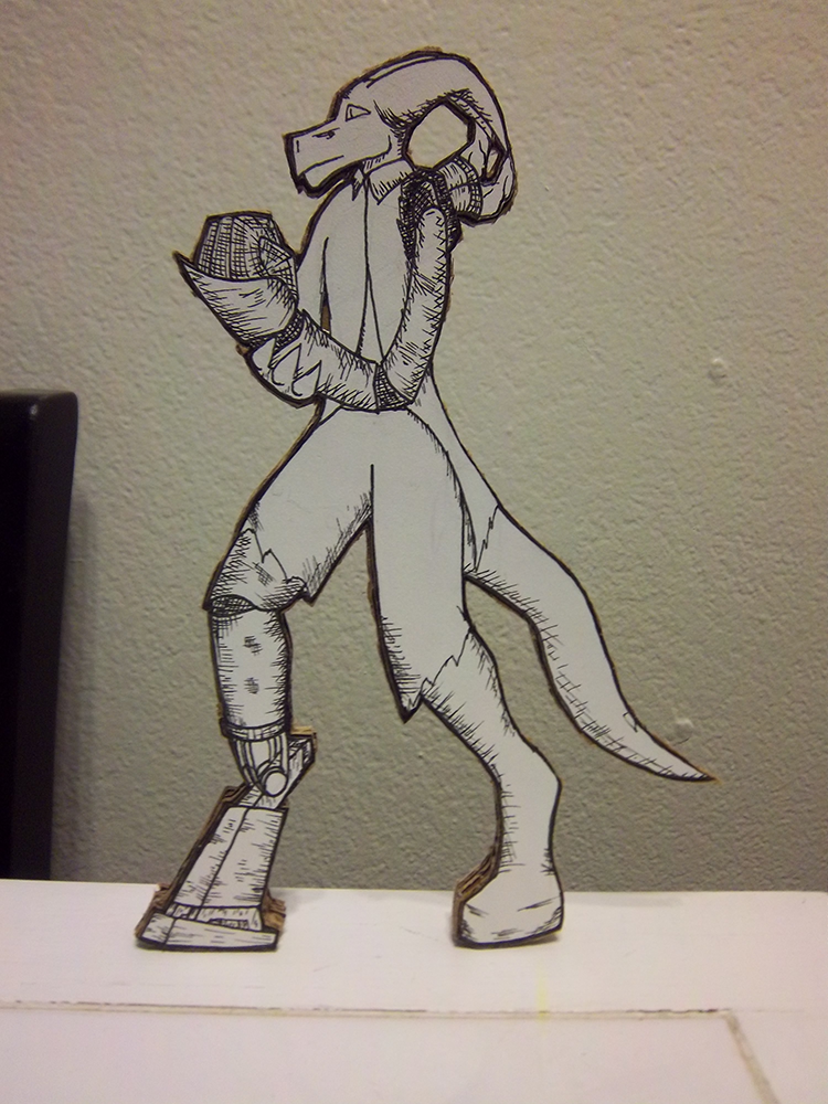 This is a poorly lit picture of a sort of cardboard cut out drawing I did of one of my comic characters. He actually does stand on his own, but only on completely flat surfaces. Tried getting him on my kitchen table to get better light, but he wouldn't cooperate.