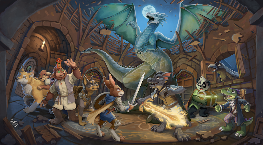 One of the biggest illustrations I've worked on, featuring (from left to right): Cedar, Croc's blink dog (husky-like) Gamow, Nini's daughter Nini, the bugbear cleric Mephistophenes, Nini's familiar (ferret-like) Walnut, Elran's blink dog (doberman-like) Elran, the harengon warlock Eliza, the evil hag/dragon Hart, dragonborn bard Paco, pandafolk druid Shroud, Croc's giant raven familiar Croc, the kobold/gator bard