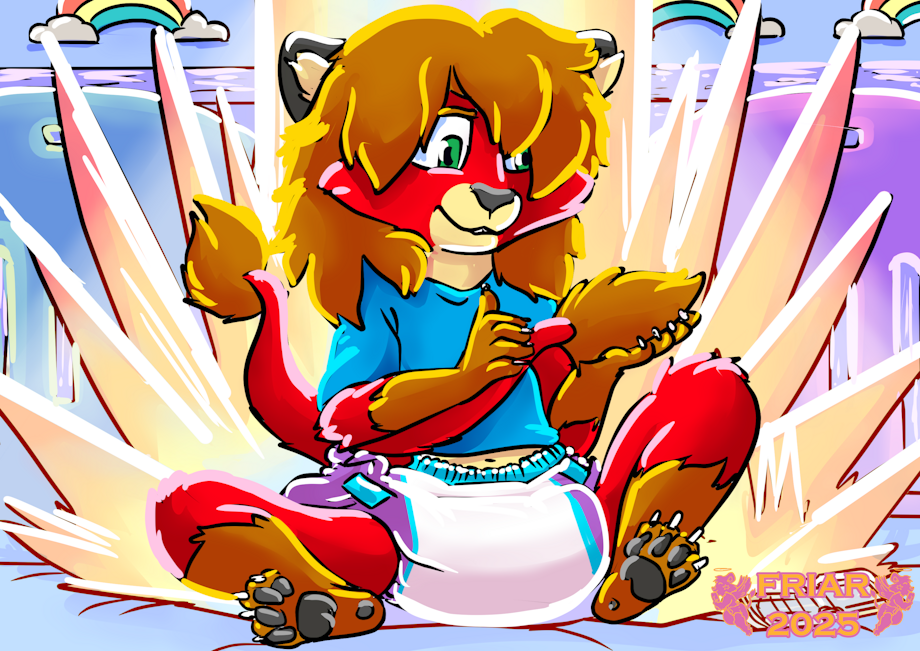 Illustration of Ozzy the wet and messy diapered and recently transformed lion sitting in his playpen, stroking one of his new tailtufts.