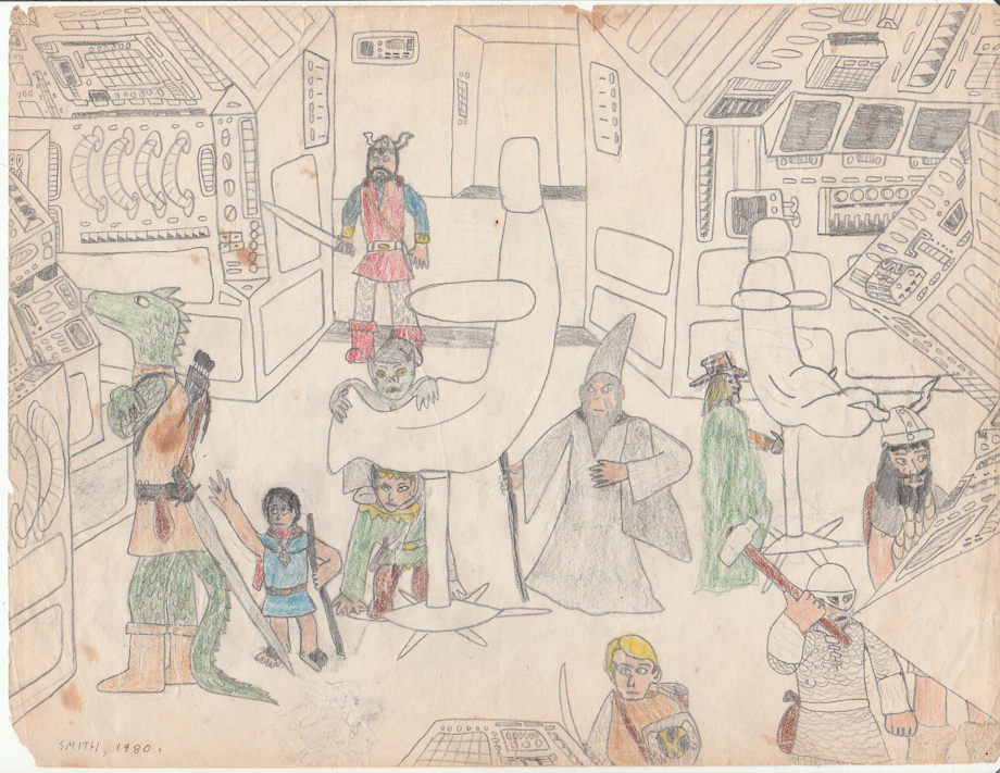 This is a picture of an adventure from our In The Labyrinth campaign (I say "our" because Scott and I took turns game mastering). The premise was a group of fantasy adventurers investigate the wreck of a crashed spaceship full of aliens and strange technology (I got the idea from a D&D module called Expedition to the Barrier Peaks, which I've never played). It was my first attempt at drawing technological stuff, which is the focus of the picture. Hence, the characters are all just standing around looking at stuff they don't understand.