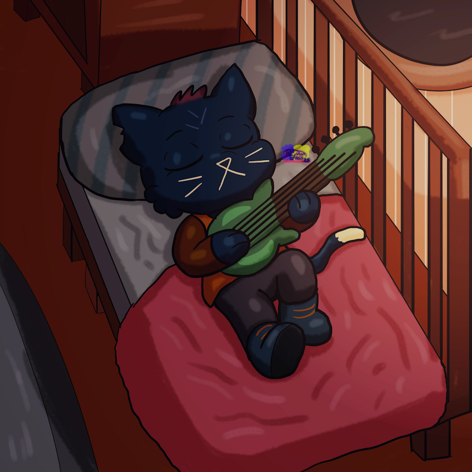 After a long day in town, and after practicing with her bass guitar, she is exhausted and goes to bed, forgetting to put the instrument down on the floor, yeah, she is exhausted.