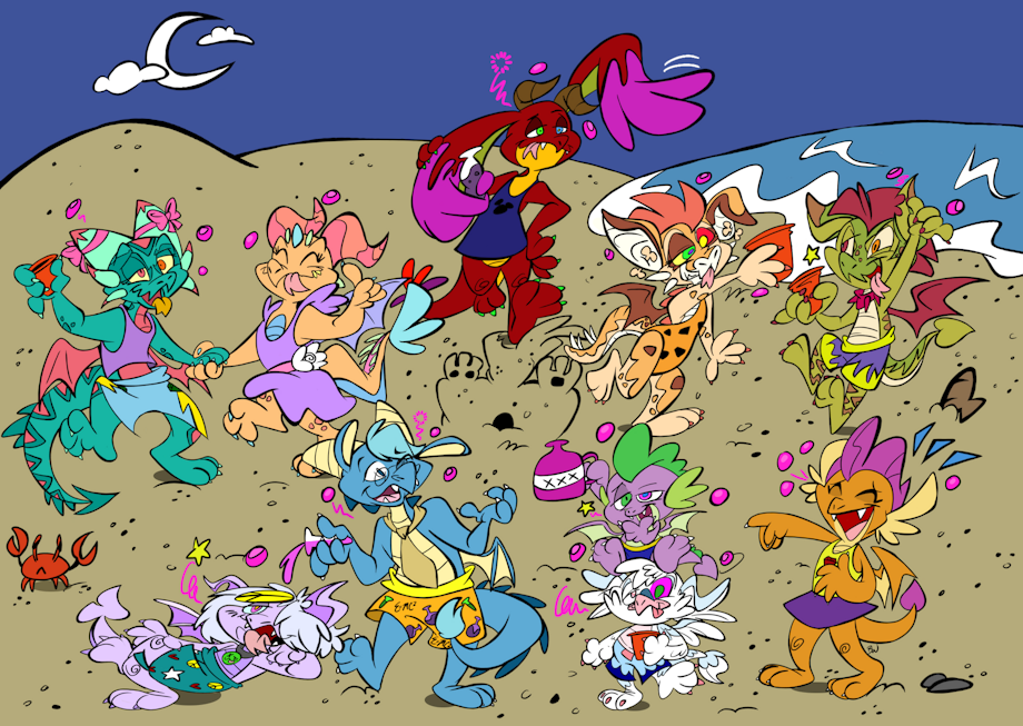 A beach, nighttime & lots of shine-fueled dragons having an awesome party, cheers!