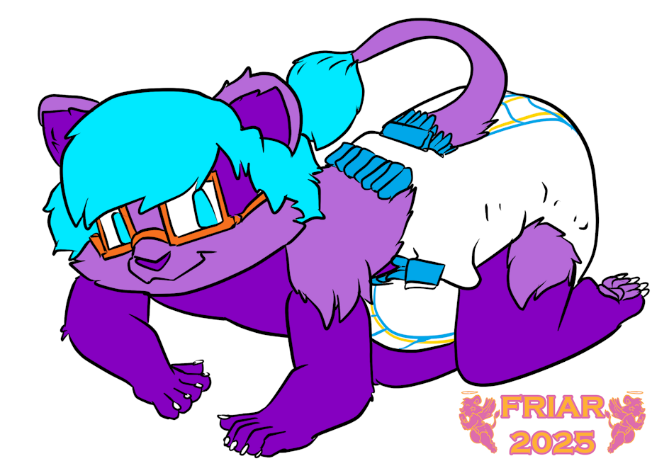 Illustration of Everett the wet and messy transformed purple diapered lion crawling on the floor besides his bed with his long snake dragon plushie.