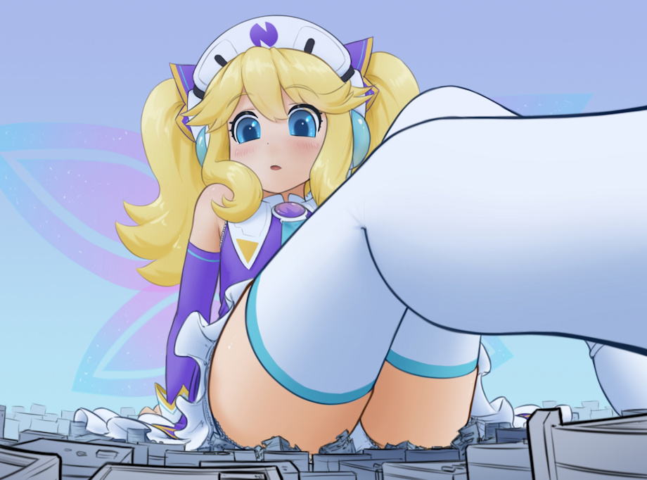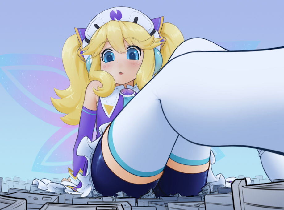 That's one extremely Bigsty! Wonderful perspective in many ways, even her arm going further into the background is appropriately adjusted for scaling. The cityscape's buildings look so small by comparison, even as they get closer to the camera. I like the different atmospheric fading layers too, not to mention the grand shadow she casts. Her legs magnifying more and more into the foreground look amazing, those massive thighs are the best. Super cute surprised and curious expression as she looks down at the sprawling city beneath her, she's just sitting like normal! Her frilly dress spreading out is phenomenally handled, the way they properly shift to go around her legs with gravity as well as circle around her body is seriously impressive. I also really like how her tie and such are properly angled to show her leaning back a bit with her posture!