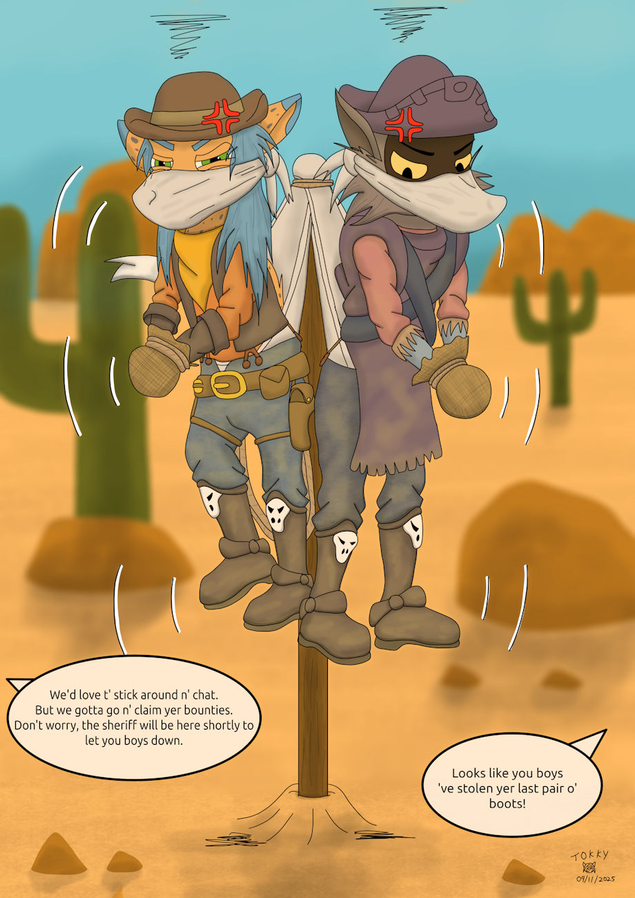 A pair of notorious boot bandits wind up being caught by a pair of bounty hunters. Will they be able to escape their bindings before they're thrown in jail for good?