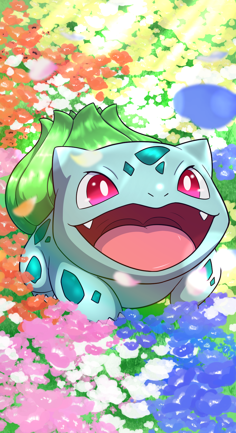 A happy bulbasaur on a field of flowers,