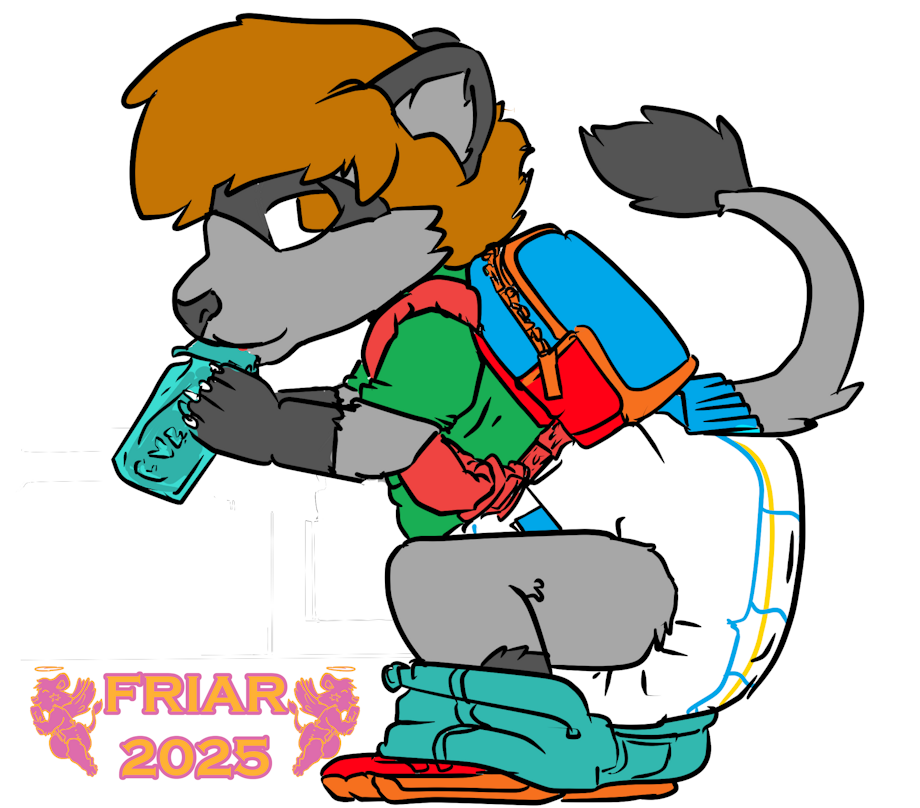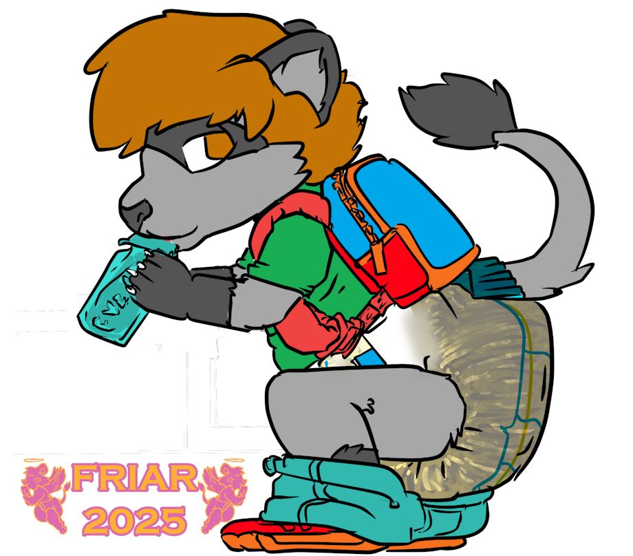 Illustration of Tylahn the transformed wet and messy diapered lion defiantly crouched down next to an open locker with books and diapers, drinking from a bottle while revealing his diaper under his shorts.