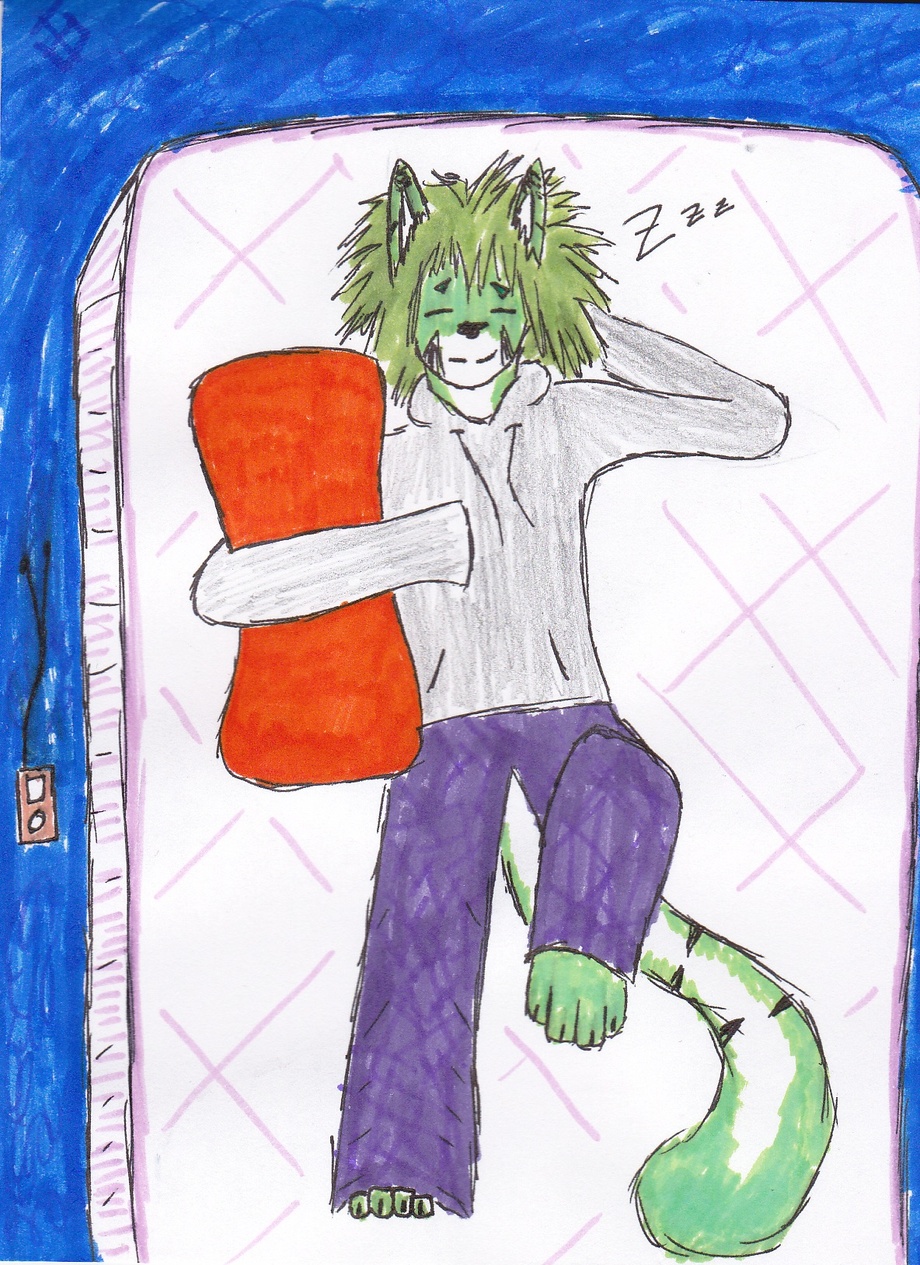 After a long day of painting, sketching, drawing and other artistic activities in which Green partakes in, and a very relaxing shower, She lays out on your bed ad hold her pillow in he arm.