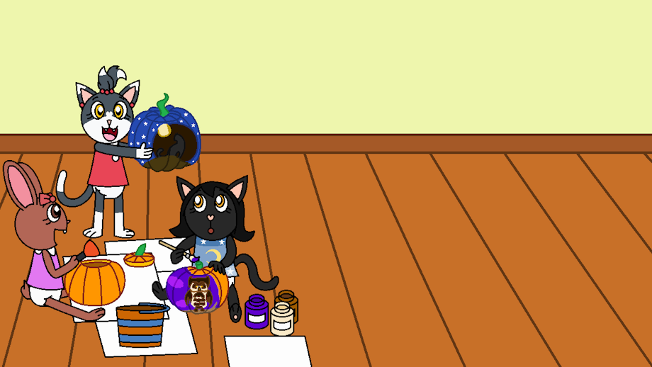 Tiffany showing her friends Amy, Misty, & Bolty her completed jack-o'-lantern!