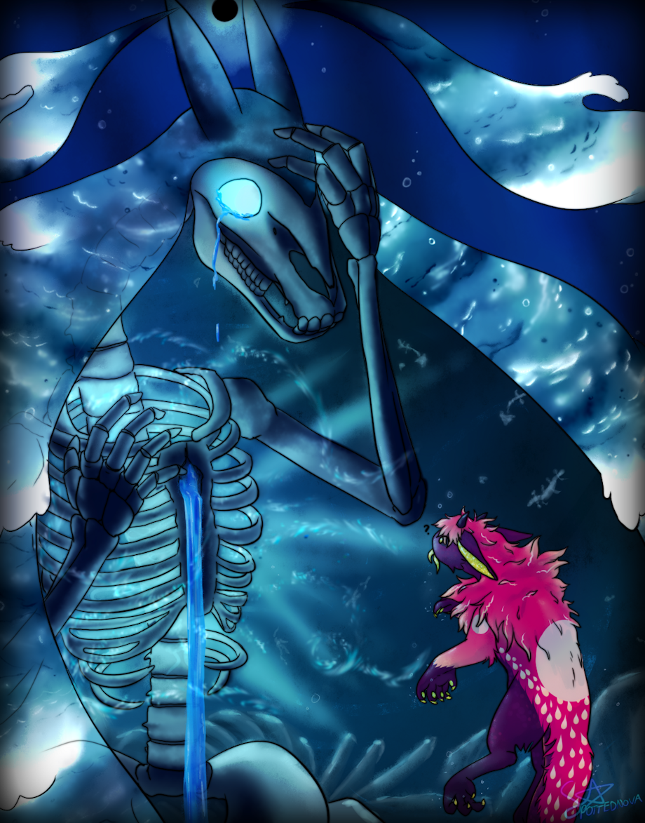 As Stardrop's actions seemed to soothe Lapsus somewhat, Carver noticed a familiar pull at his being. They must be returning to the Starfix realm, or maybe even back home, he figured. Mission accomplished and all that. He began to step forward to reunite with the snowgrem, but blackness washed over his vision first. He wasn't bothered initially, even as he felt cool water against his feet. Had they been at a beach before getting pulled into the Starfix? He couldn't remember. But as his eyes opened and he scanned over the endless sea that surrounded him, he noticed something very wrong. "Star?" He turned on the surface, ignorant to the ripples radiating below him, eyes wide and emotion flooding his chest. Where is she? "Star! Hey, hey, where are you?!" He broke into a run, his feral form allowing his frantic search to cover more ground than he typically would. Or, it would have been able to, if a giant, boney hand hadn't shot through the surface to pull him under. Instinctively he snapped his mouth shut, twisting and writhing as he tried to escape the creature's grasp before he drowned as he was dragged under. She held fast until he was forced to cough out the last of his air, and he paused in confusion as the water was perfectly breathable to him. Once he'd acknowledged that he wasn't in immediate danger of drowning, Carver turned his attention to the creature in front of him. She was leaking blue liquid- crying, oozing- and he could hear echoes of sobs. The skeleton beast seemed overcome with despair, and the situation clicked in Carver's head. Stardrop had soothed Lapsus. Did that mean that now this one, Mare, was looking for comfort too? Her head lowered, and her hand almost seemed to cradle the pouring wound in her chest. The red grem glanced around, trying to find someone, anyone better suited to the task, but a resigned sigh broke from his chest as he accepted that it would be up to him. "I'm not... great at this, but..." Carver trailed off, approaching the corpse goddess. We'd better end up back in the same place after this, he thought, steeling himself before reaching into the blue ooze of the wound, and the pain it held within.