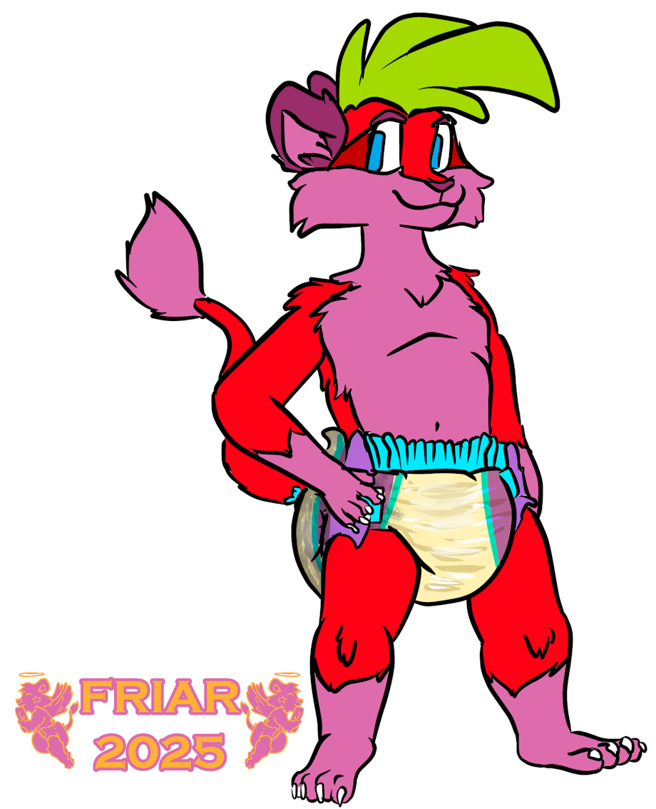 Illustration of Berry the transformed wet and messy diapered lion posing in the treehouse.